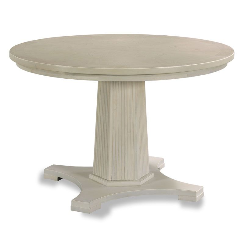 A simply gorgeous table adapted from the 19th century English regency style. A circular top is veneered in a sunburst pattern over a delicate apron rail supported by a central tapered hexagon column that is accented with reeded details mounted to a quatrefoil shaped base.