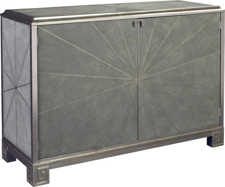 W 50 D 19 H 34 Sterling Finished Chiffonier in Faux Charcoal Shagreen Leather Inlay with Gilded Accents In Stock Buy Now
