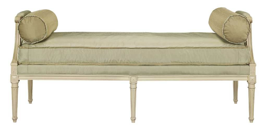 The Woodward Bench was inspired by an antique French, Louis XVI bench with arms. Like the original antique bench, the piece has fluted, tapered legs and arms with hand-carved details. The base is upholstered with a loose seat cushion and two round bolsters. Standard with welt around the arms and base only. Two 7 1/ 2 x 26-inch goose feather bolsters standard. 1-piece bench Luxury Spring-Down seat cushion standard. The back of the Woodward is flat to allow flush placement against a wall. The center stretcher is decorative.