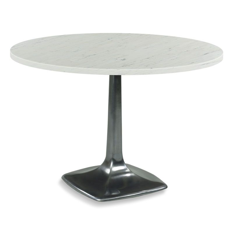 A round or square stone top rests over a cast metal tapering central column and base in a gunmetal finish.