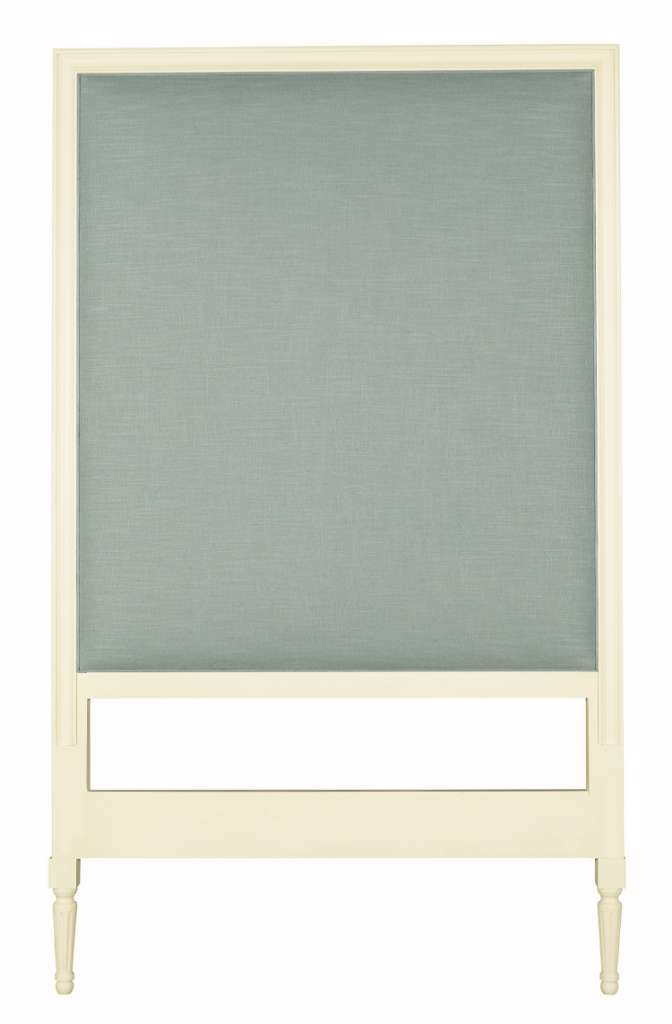 The Candler Bed muse was a pair of upholstered vintage French chairs. A signature of Suzanne's work is dressmaker details mingled with upholstery. The Candler bed allows for crisp tailoring and can be trimmed with petite nails, grosgrain ribbon or welt. A slipcover draped over the upholstered back allowing the finish to show through the tied slipcover. The hand-carved frame features a very high upholstered headboard along with upholstered footboard and side rails. Available in twin, queen, king and California king beds, as headboards only, slipcovers for the headboard and footboard. Shown as 1557-10 Candler Twin Headboard.