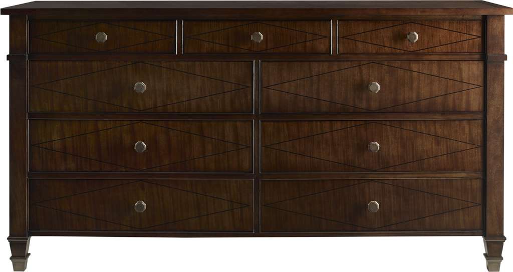 Our regal Connaught Dresser is just as at home in a modern interior as it is in a traditional one. Featuring diamond shaped ebony inlay and hex shaped hardware, this distinctive nine drawer dresser is all dressed up for a night in. Top three drawers feature chocolate felt lining with thoughtfully designed compartments. Aged Brass hardware standard. A companion Connaught Night Stand is also available.