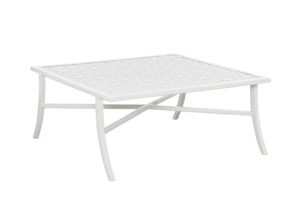 The Haret series is an elegant metal outdoor collection with a distinctive signature fretwork on the seat, back and tops of each piece and with lyrical lines of the arms, legs and top rails of the upholstered pieces. The Haret Outdoor Low Cocktail Table is perfectly scaled to work with the Haret Lounge Chair or as a standalone item. The Haret is offered in a Cloud White or Smoke Grey finish. A custom fitted protective cover is sold separately as HCD8900-PC.