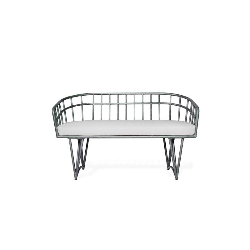 **AVAILABILITY SHOWN IS FOR FRAME ONLY. PLEASE CALL OR EMAIL FOR CUSHION AVAILABILITY** A charming bench for outdoor seating with a curved back over a colonnade of round spindles above an upholstered seat cushion that is elevated on metal legs.