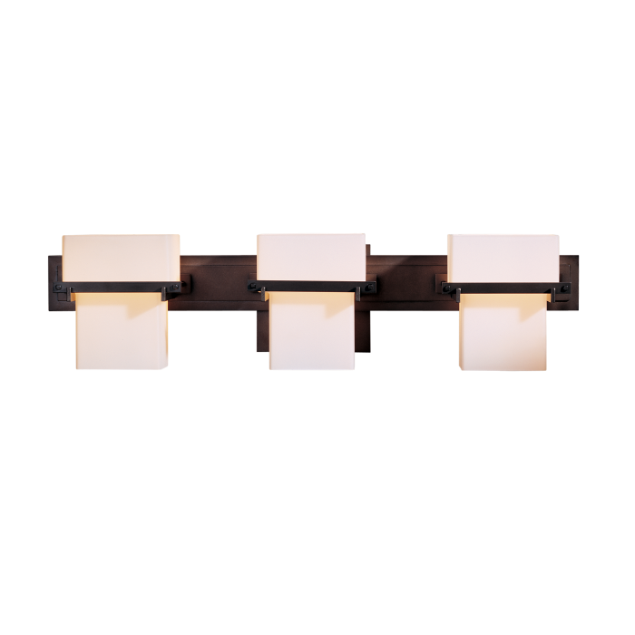 From the mounting plate to the hand-forged steel bars outlining the two-tiered glass, our Kakomi Three Light Sconce is a collection of lines and planes. Whether installed in a square room for visual harmony or a room of a different shape to create striking contrast, it works.