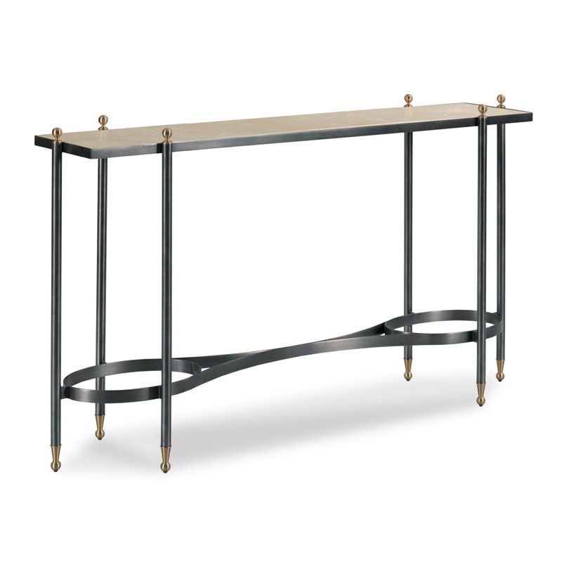 A lovely table adapted from mid 19th Century French garden furniture. Round metal posts crowned with brass finials support a rectangular inset stone top over a curvaceous and intricate metal stretcher.