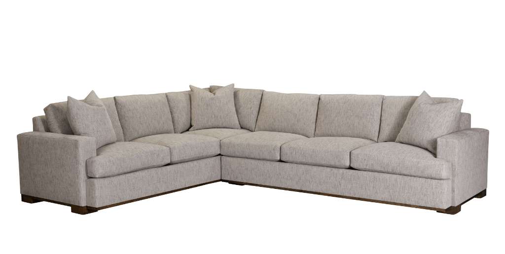 The resplendent Mark Sectional is as grand as they come and can be specified to accommodate any size space. The fully upholstered frames, resting on wood base. The HC3403-46 Mark RAF Sofa and HC3403-56 Mark LAF Corner Sofa shown. When ordering this item in leather, please note that pillows are not included and must be purchased separately. To match the standard pillows included with the fabric version, order an additional quantity of pillow SKU HC920-96. Standard without nail trim. Also available with optional NS-34 faceted nail trim as Greek-key detail.