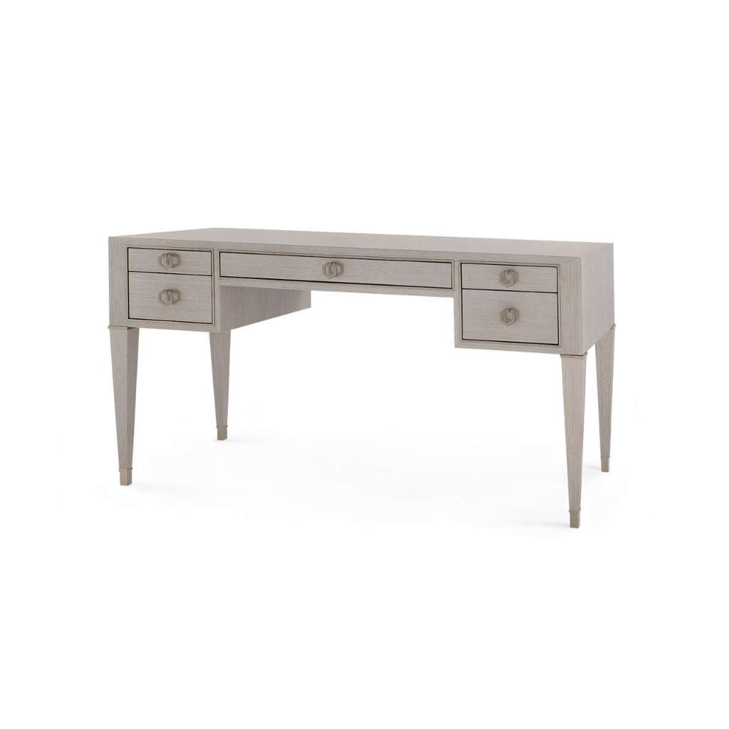 The chic Morris Desk taps French-styled elegance and gorgeous champagne accents to create a dignified piece that could be used as a home workspace or even a bedroom vanity, paired with a mirror. A refined silhouette and thoughtfully designed details, such as slim, tapered legs and shining sabots, bring the piece’s old-world charm to the forefront. Petite proportions mark the look of its five drawers, with two flanking its sides and sleek middle drawer in the center. They’re all bordered by a champagne-gilded ribbon, which creates a glamorous contrast to the Morris’s straight-grain veneer finish. Topped with metallic pulls with geometric flair, the drawers softly glide to reveal expertly crafted stained interiors, perfect for storing anything from office supplies to cosmetics. Each luxurious element comes together in graceful harmony, resulting in a fabulous furnishing you’ll love.