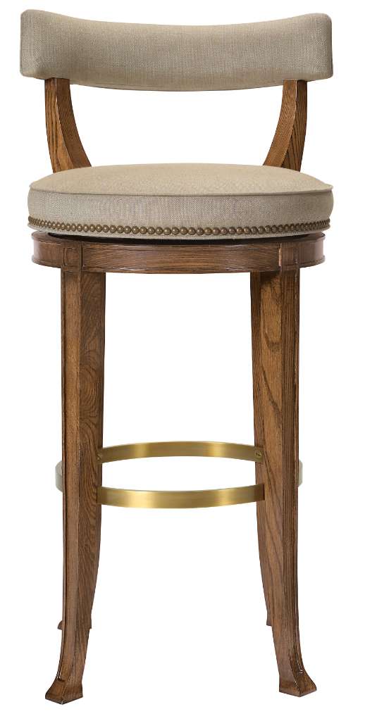 The Newbury Bar Stool features a Klismos shaped back. Each feature a tailored, round “pillbox” upholstered seat with standard NS-08 nail head trim and an exposed wood apron with raised edge details. Four carved and tapered legs with recessed panels sweep outward and are joined together by an Antique Bronze circular stretcher standard. The stretcher is also available in Antique Brass and Antique Silver. The Newbury with the Klismos back is standard with a memory swivel allowing it to return to its original position when one rises. Available in bar and counter heights.
