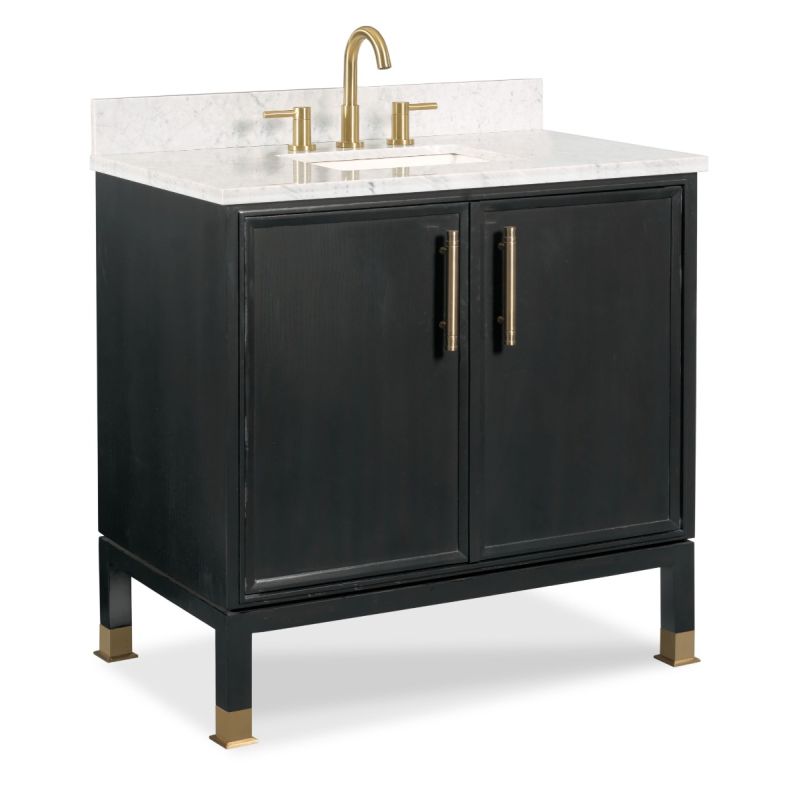 A wonderful cabinet paired with a Carrara marble rectangular top fitted with a rectangular ceramic sink and borings for your lavatory faucet selections. A pair of framed doors are elevated on sturdy squared legs that terminate to brass sabots. Cabinet has a removable access back panel: 14" W x 14.5" H for plumbing access.