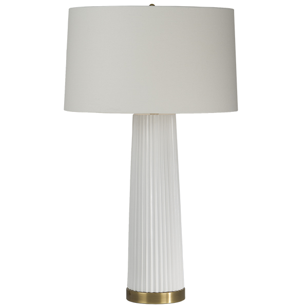 5880- PLEAT TALL 32.5″H Shade: PLEAT TAL 89016 – 18x19x11″ Rnd Drum Sailcloth White 89016 – 18x19x11″ Rnd Drum Sailcloth White White with Style These accordion pleat porcelain bodies are as crisp as a freshly pressed linen cloth. The pleats cast interesting shadows over the soft semi-matt white glaze. The soft, contemporary conical shaped vases are set on rubbed brass mountings for a clean, classic aesthetic. The lamps are finished with drum shades made with Sailcloth White fabric and capped with rubbed brass finials. White with Style White with Style These accordion pleat porcelain bodies are as crisp as a freshly pressed linen cloth. The pleats cast interesting shadows over the soft semi-matt white glaze. The soft, contemporary conical shaped vases are set on rubbed brass mountings for a clean, classic aesthetic. The lamps are finished with drum shades made with Sailcloth White fabric and capped with rubbed brass finials.