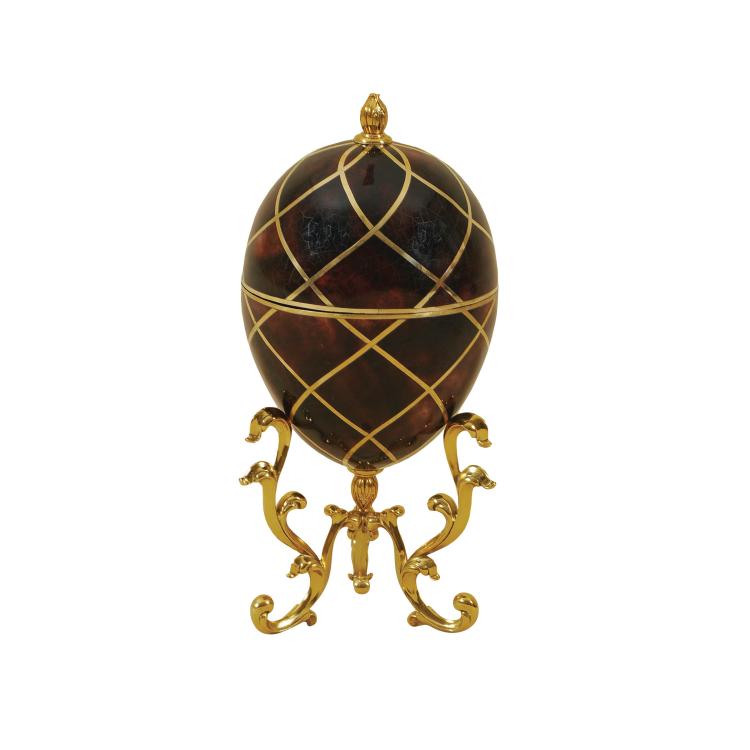 W 7 D 7 H 15 Dyed Red Penshell Inlaid Egg Shaped Box with Inlaid Brass Accents on Golden Cast Brass Stand In Stock Buy Now