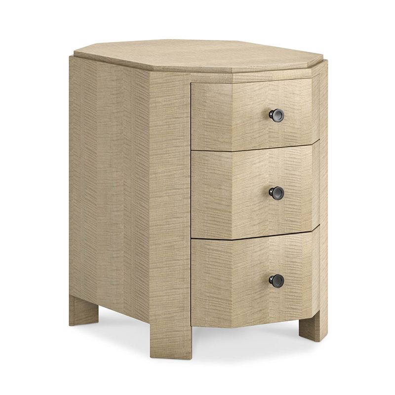 A cute small modern chest which can reside nicely at chairside with a top that is veneered with quarter sawn English sycamore over three drawers that are flanked by chamfered corner posts.