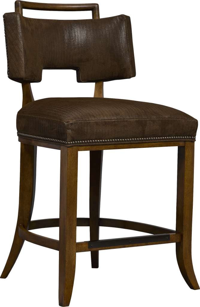 The Saint Giorgio Counter Stool is rich with detail. Beginning with the wooden pull across the back, paired with distinctive nailhead embellishments, it makes for a debonair dining choice. This stool comes standard with welt but is shown with optional NS-08 nails in a distinctive Greek key pattern. Tawny finish and NS-08 Old Brass nail head trim shown. Nail head trim available in small, petite and faceted nails only. Kickplate finish available in Antique Brass or Antique Nickel. Also available in bar height.