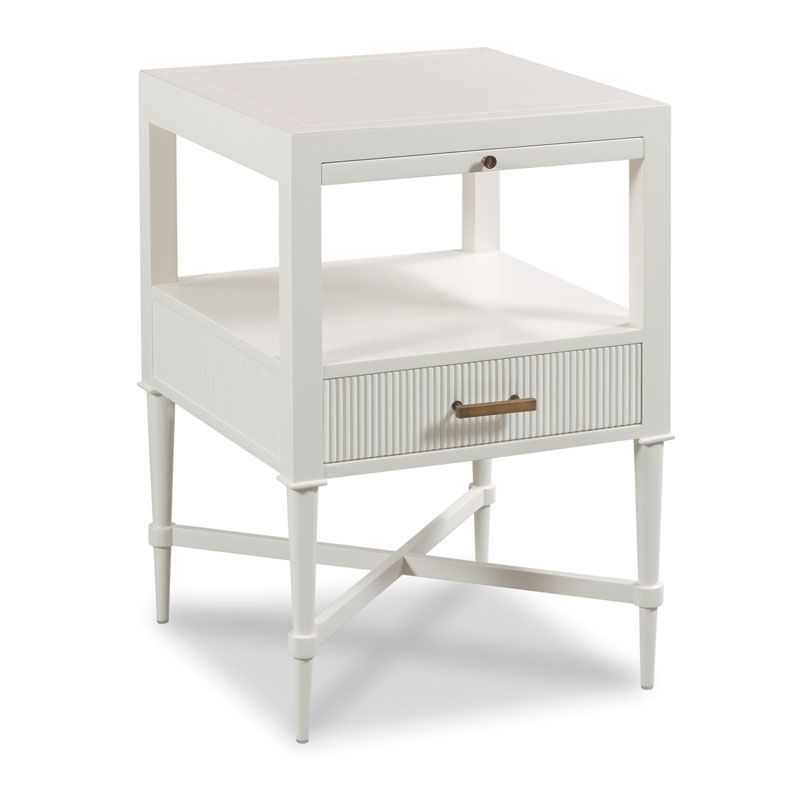 This petite bedside/lamp table features a pullout surface for drinks placed over an open area for books. The table has a reeded drawer elevated by squared tapering posts that are joined by an X stretcher.