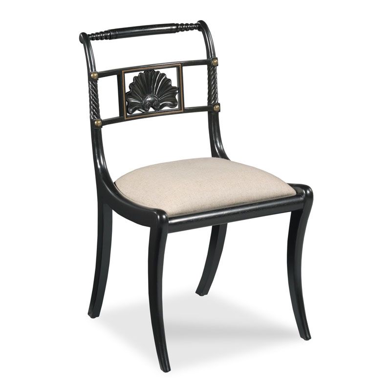 This historically inspired dining chair is scaled from the antiques of the 17th Century and has a shell motif in the back adding a twist to its historical inspiration.